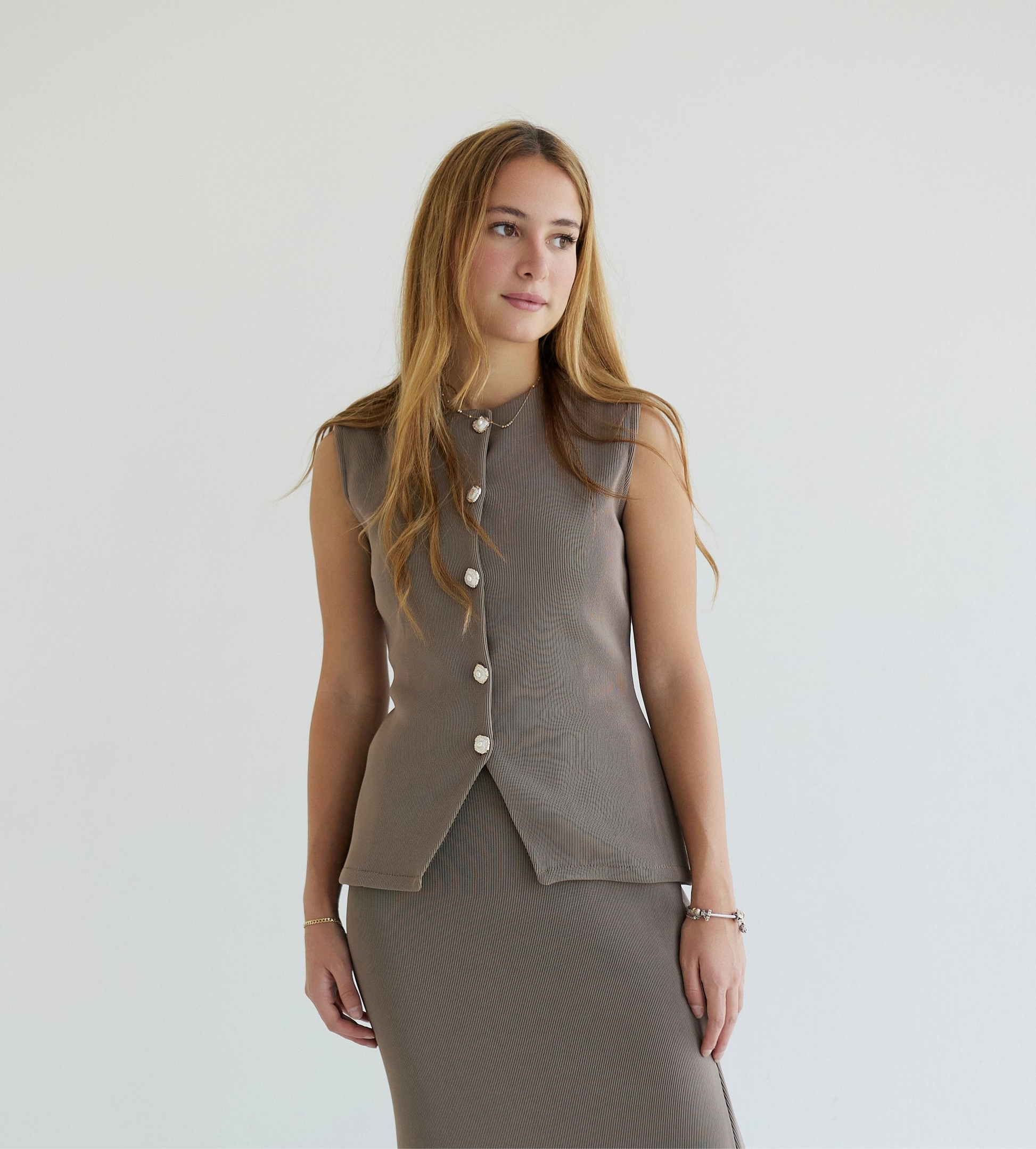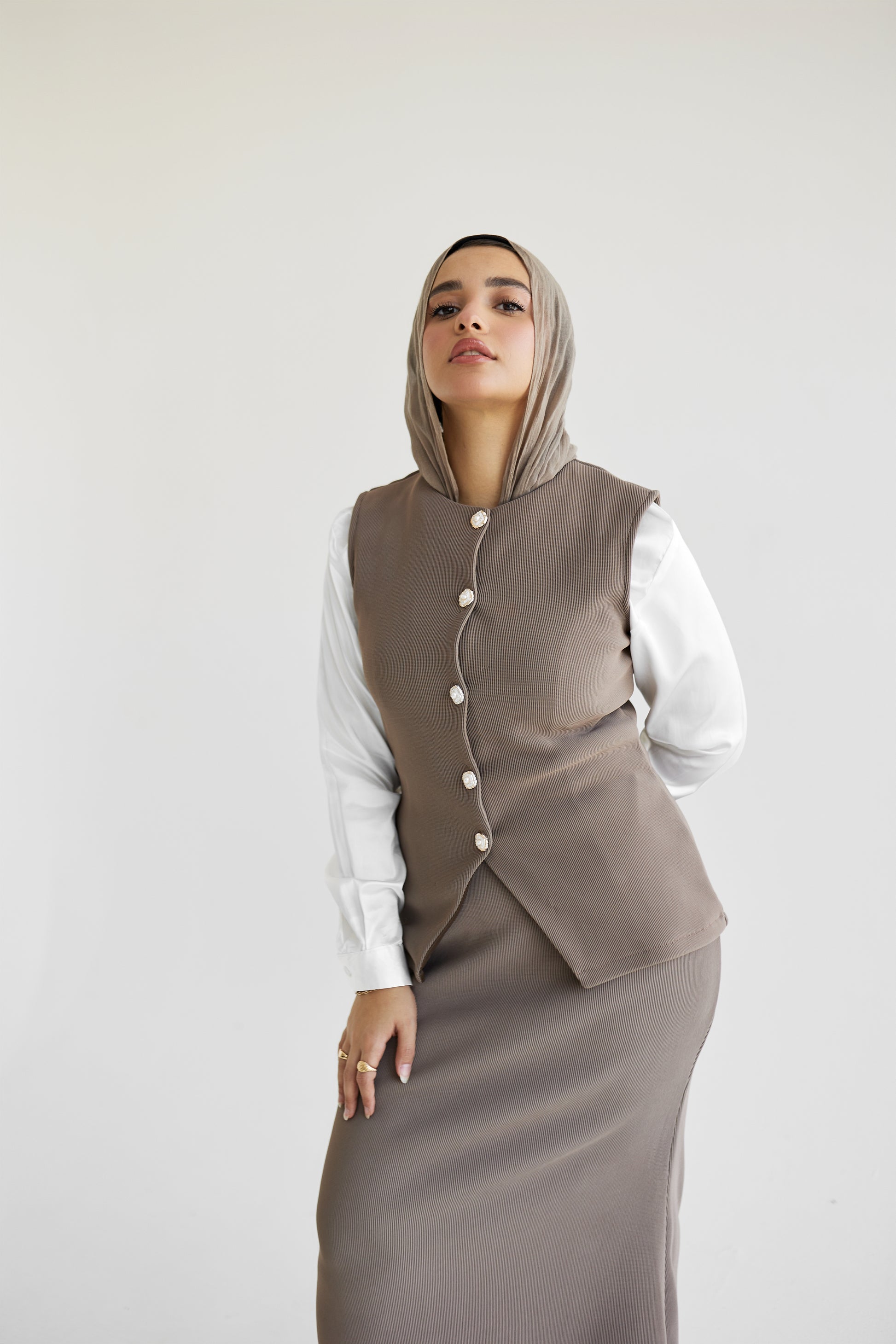 Caramel reverie set crafted from rich high-quality fabric, offers luxurious feel with a classy look. The subtle café color complements various skin tones, featuring exquisite button detailing that adds a refined touch to the minimalistic design, making it an ideal choice for an outstanding effortless chic look.