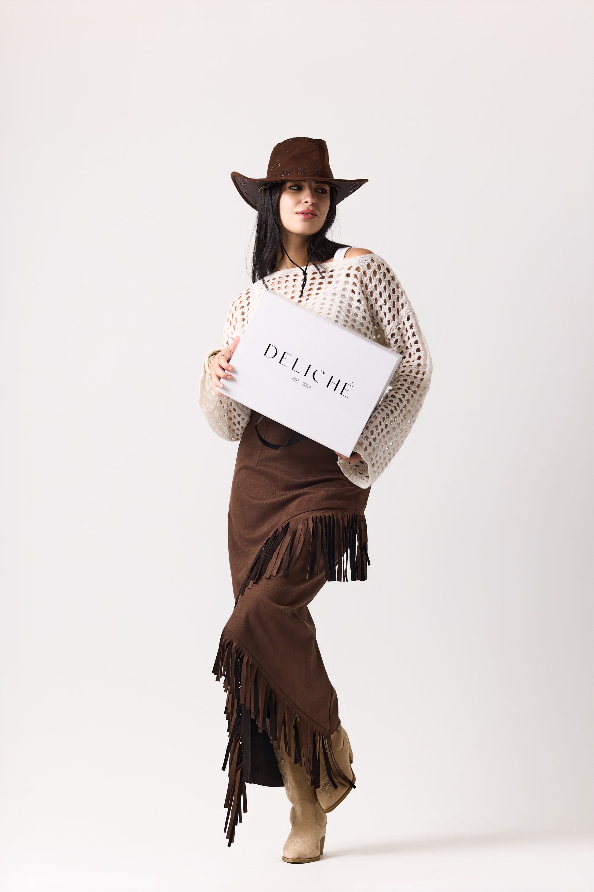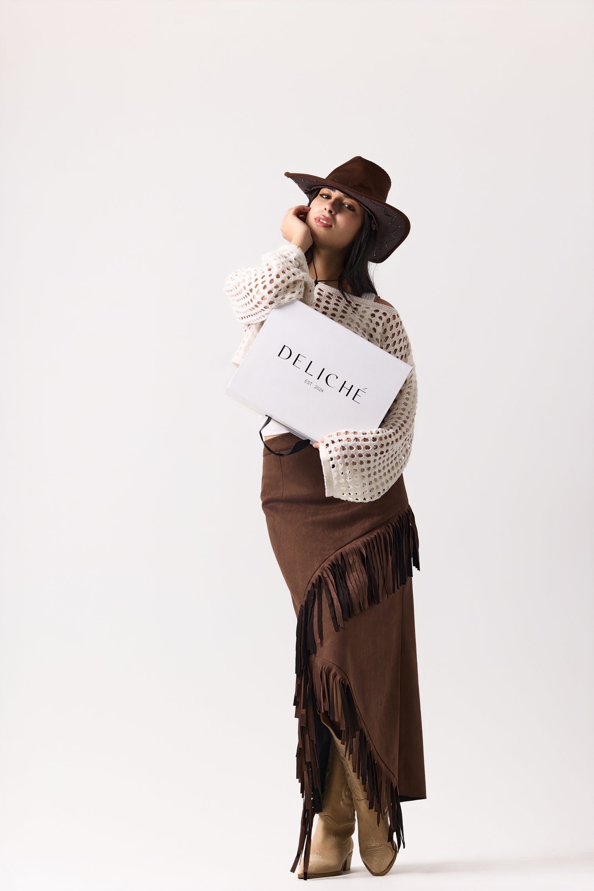 A chocolate suede fringe skirt with a unique, stylish design that adds effortless movement and charm. Crafted from premium suede for a soft, elevated feel — perfect for creating standout looks.