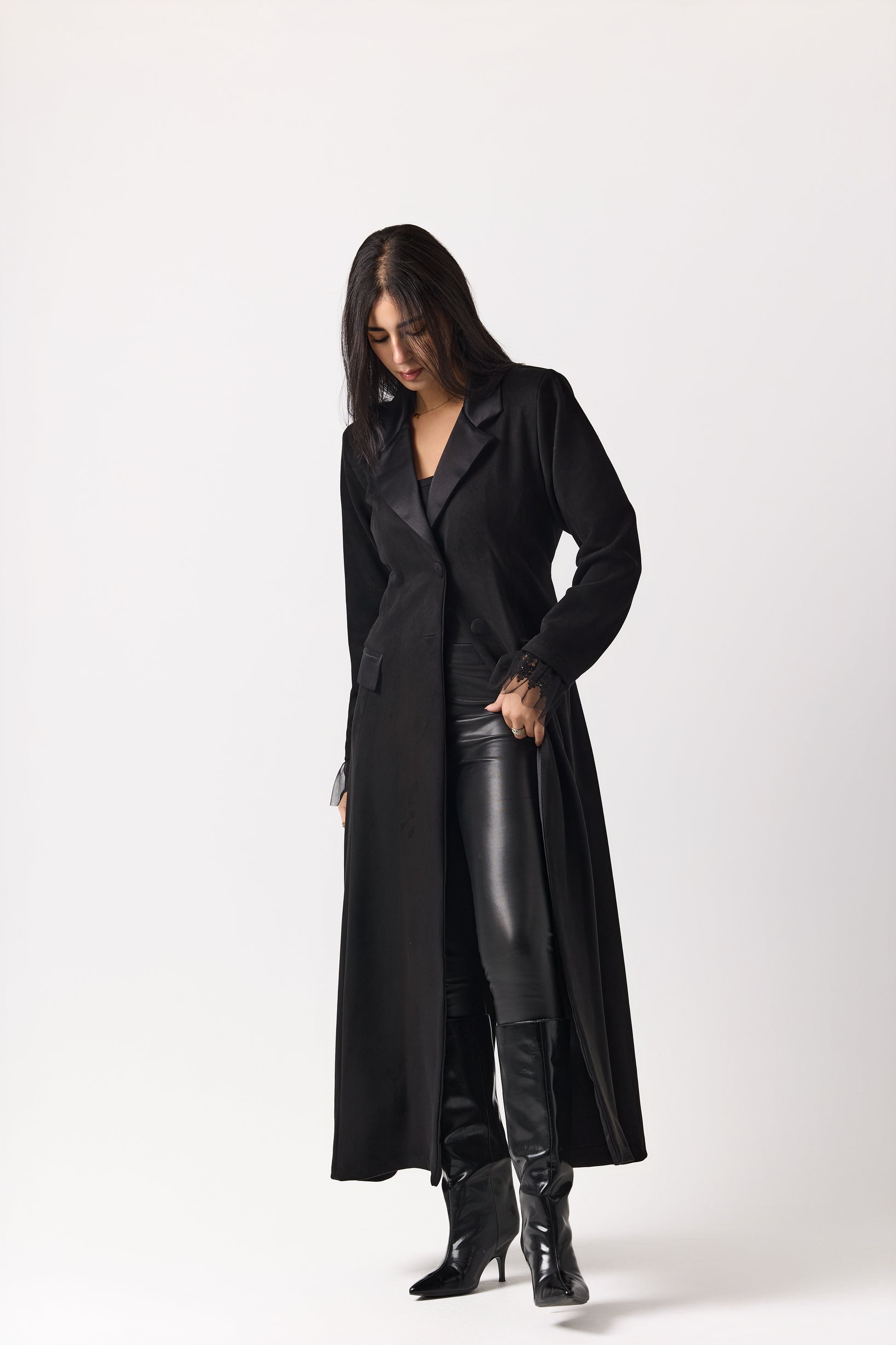 The Iconic Noir Long Coat is a true statement piece, rich in detail and designed to exude luxury and uniqueness. Finished with an adjustable belt for a custom fit. A timeless piece your wardrobe will depend on for every occasion and every bold moment.