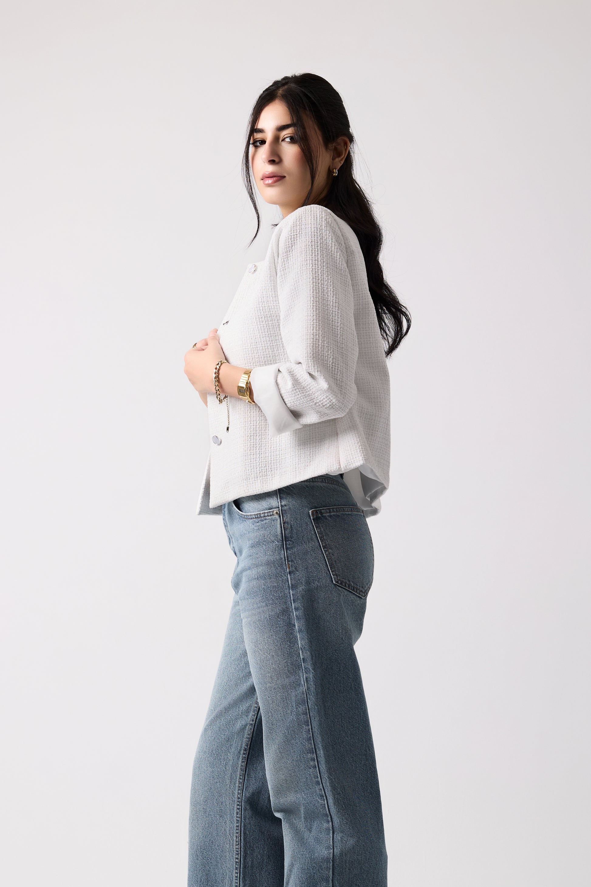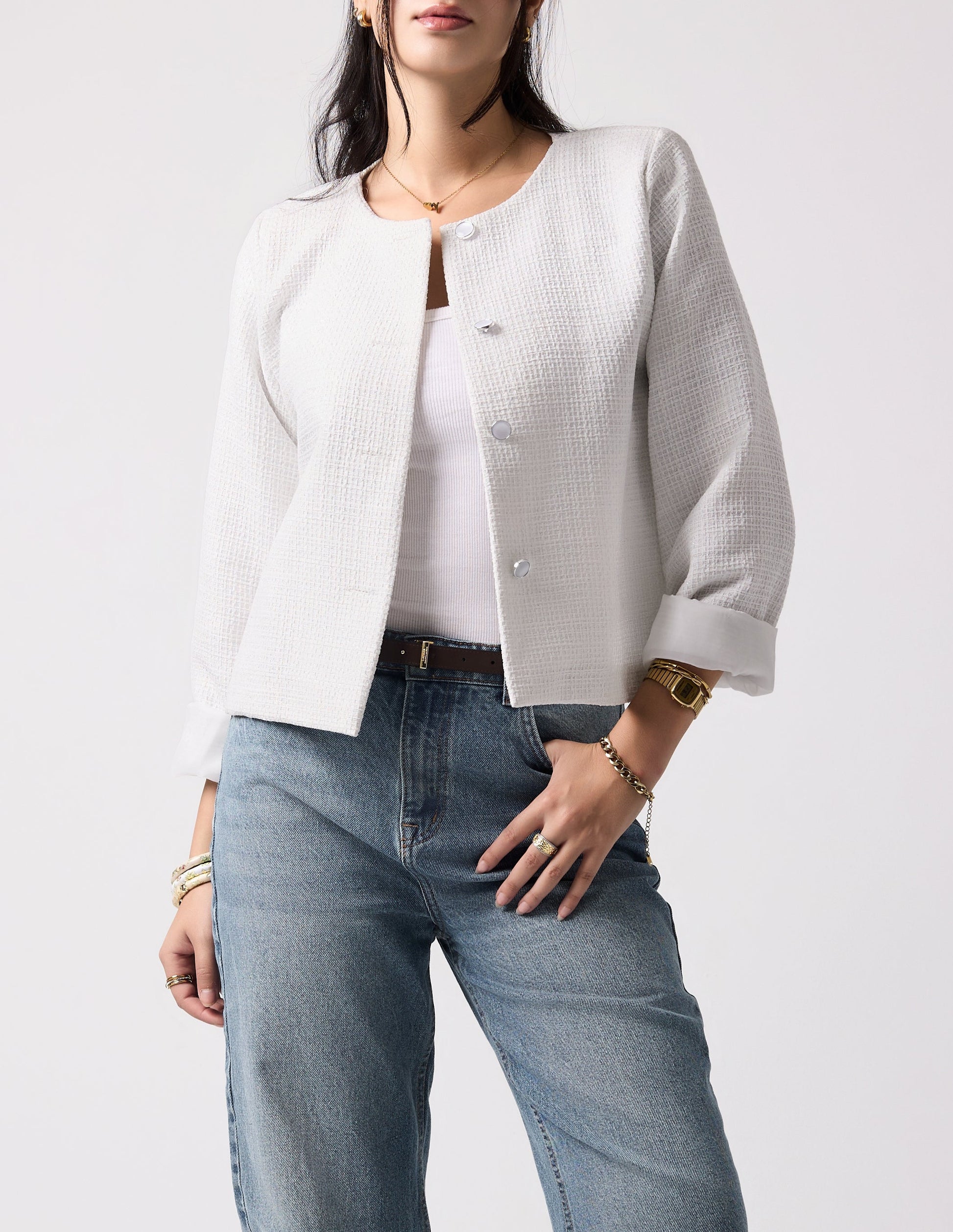 Bold statement bright white textured jacket, infused with a subtle silver sheen for added sophistication. Could be styled in smart casual and formal way.