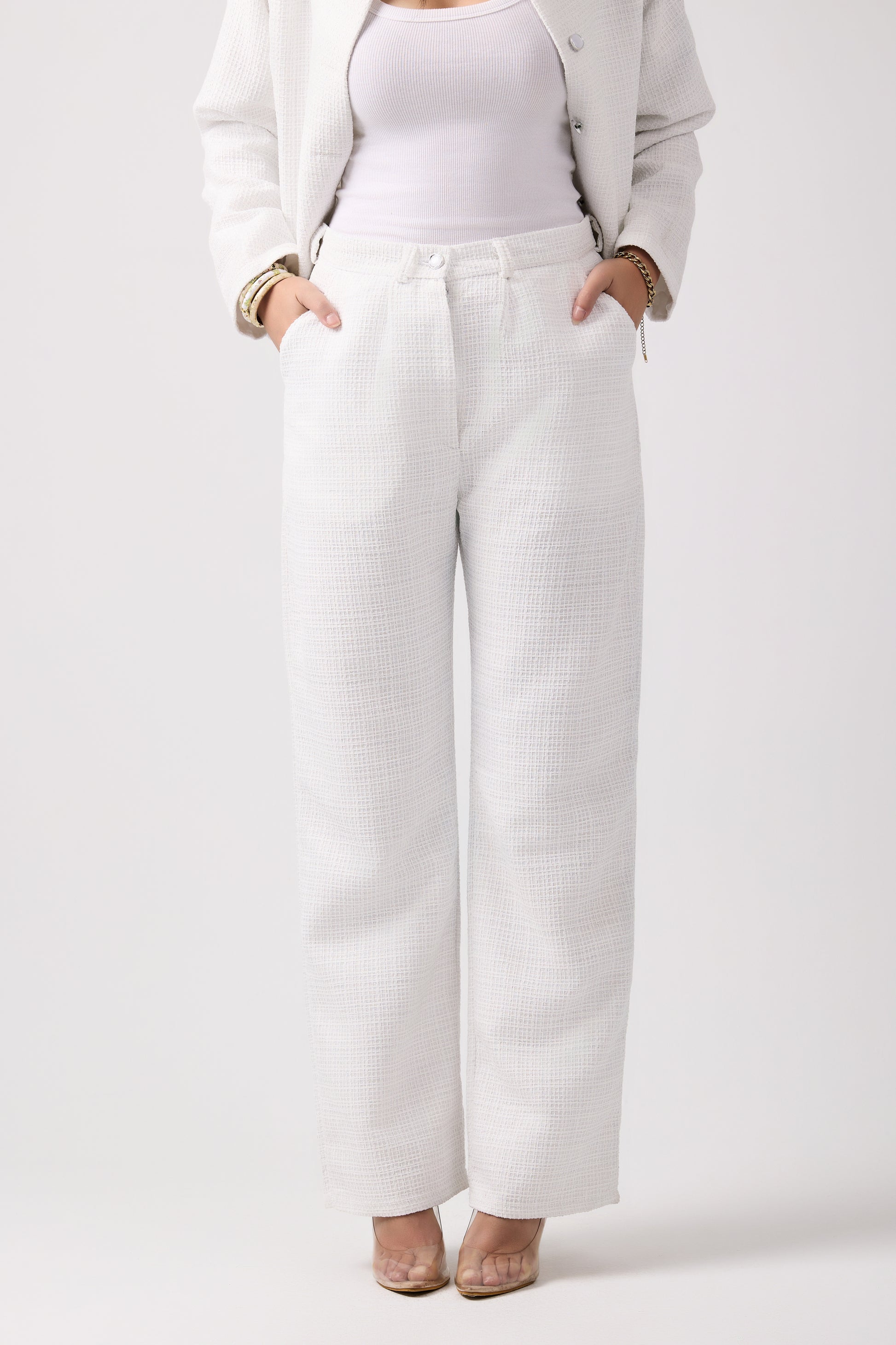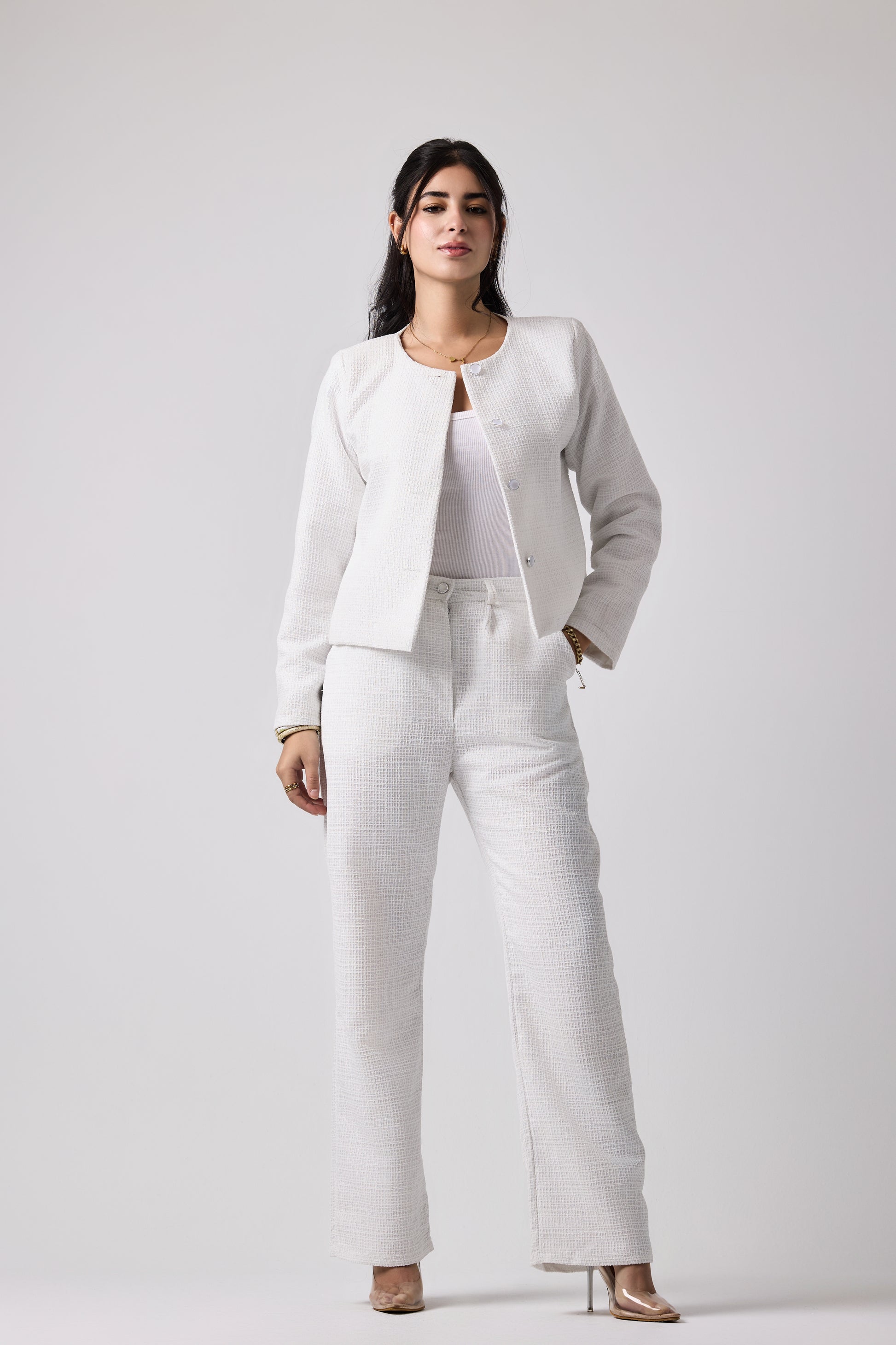 Shine brightly in this statement bridal white textured set, infused with a subtle silver sheen for added sophistication. The details in this set makes it perfect for both formal occasions.