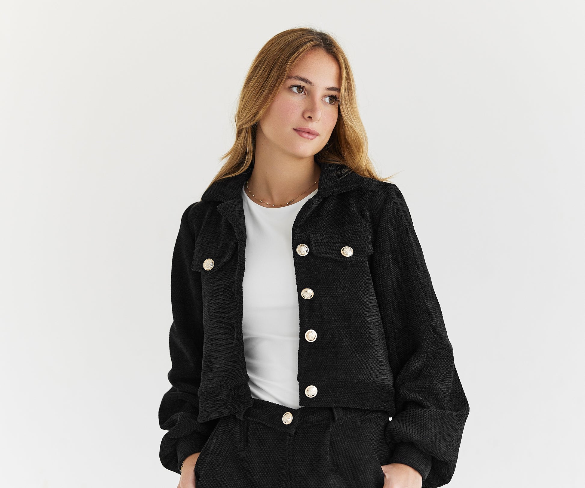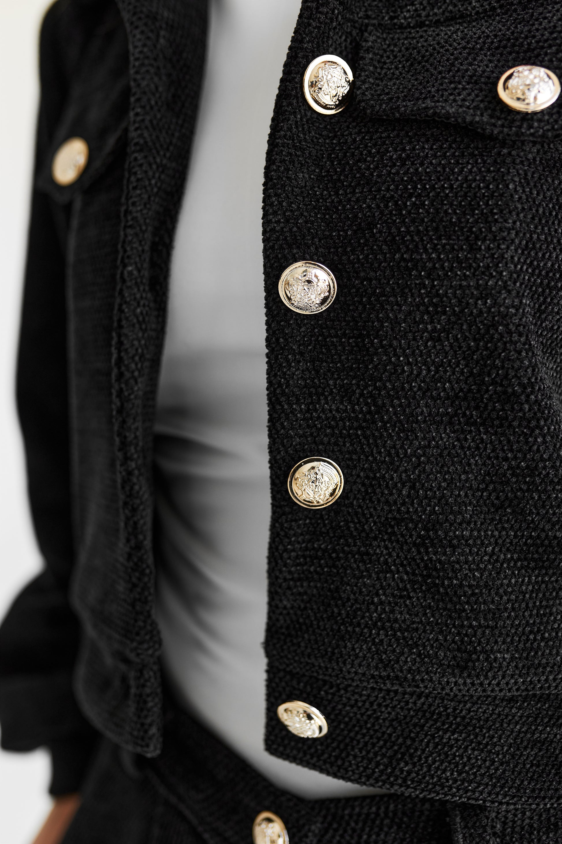 This statement cropped jacket embodies elegance, comfort, and warmth. Crafted from a luxurious, premium-lined fabric, it showcases exquisite gold buttons for a touch of uniqueness. Perfect for elevating your style on multiple occasions.